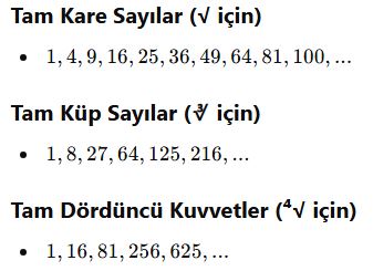 Bu değerleri bilmek, köklü sayılarla işlem yaparken hız kazandırır.